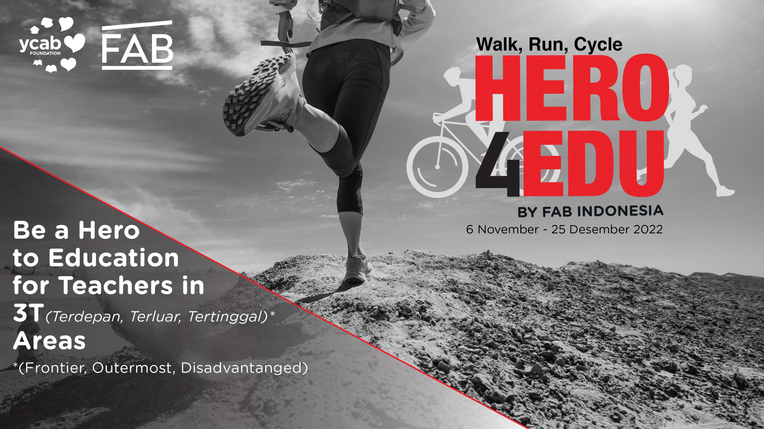 Coinciding the National Heroes’ Day, Yayasan Cinta Anak Bangsa (YCAB), FAB Indonesia, United Creative, and Benih Baik launched #HERO4EDU movement which will take place from November 6 to December 25, 2022. #HERO4EDU is a virtual running, walking, and biking event that can be done anywhere and anytime. Every IDR 100,000 donation equals 1KM walking/biking and 4KM cycling.