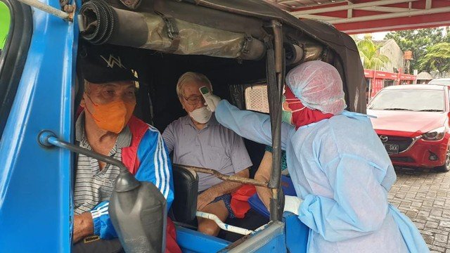 Pada video tersebut terlihat dua lansia duduk di kursi penumpang bajaj. Keduanya melakukan vaksinsasi Covid-19 untuk booster secara drive thru.